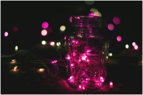 A mason jar filled with glowing pink neon string lights surrounded by bokeh in a dark setting.