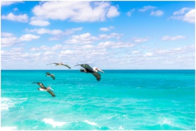 A group of pelicans flying gracefully above a vibrant turquoise ocean under a bright blue sky.