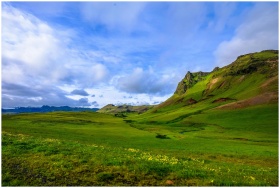 Expansive green valley under a bright blue sky with dramatic mountain landscape.