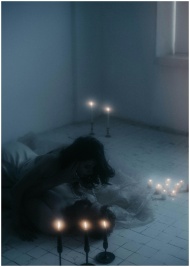 A couple embracing on a dimly lit floor surrounded by candles, capturing a romantic mood.