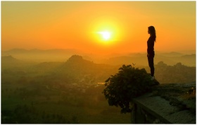 A woman stands silhouetted against a vibrant sunset on a cliff overlooking a misty landscape.