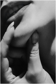 Black and white close-up of a woman's face with fingers touching chin, emphasizing emotion.