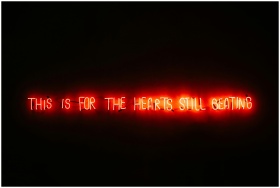 Red neon sign glowing with the message "This is for the hearts still beating" on a dark background.