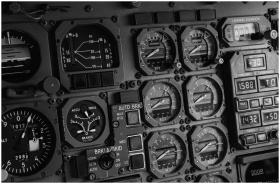 Close-up of an airplane cockpit's intricate control panel in monochrome, highlighting aviation technology.