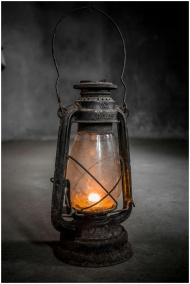 An antique lantern illuminated by a candle in a di