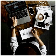 Top view of a creative workspace with laptop, coffee, and hand lettering for design inspiration.