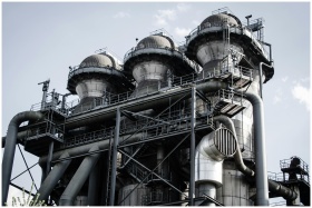 A powerful industrial structure with pipes and machinery in Duisburg, Germany.