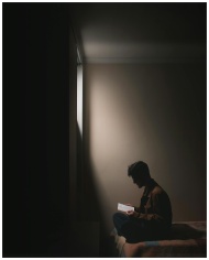 Silhouette of a man sitting on a bed in a dark room, reading a book by window light.