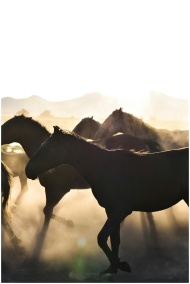 A vibrant scene of horses running through dust at sunrise, backlit by the sun.