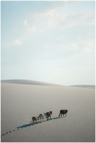 A herd of cows traverses vast sand dunes under a clear sky, leaving footprints behind.