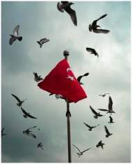 Dramatic scene with Turkish flag and flying birds under moody skies.