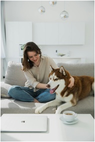 Young woman relaxing on the couch with her Siberian Husky in a modern living room.
