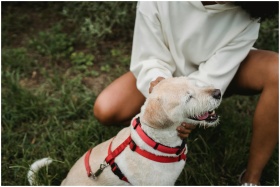 High angle of crop anonymous African American female owner wearing casual clothes sitting on lawn with Labrador Retriever
