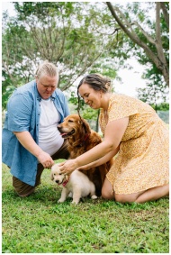 A loving couple plays with their two dogs in a sun