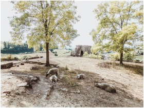 Idyllic countryside view featuring sheep grazing under trees in a rural landscape.