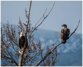Two bald eagles perched on a tree branch in Wenatchee, WA during winter.