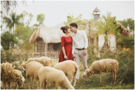 A couple poses romantically among sheep in a rural farm setting in Hải Phòng, Vietnam.