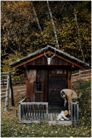 A father and child play together outside a rustic wooden cabin surrounded by autumn foliage.