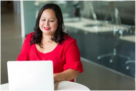 Asian woman smiling while working on a laptop in a