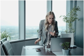 Businesswoman engaging in a video call, demonstrating leadership in a modern office setting.