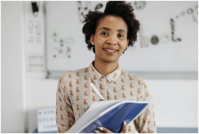 Confident female teacher smiling while holding a notebook in a classroom setting.