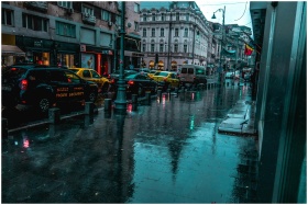 A wet city street with traffic and classic archite