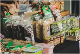 An assortment of packaged foods displayed on a market stall indoors, showcasing variety.