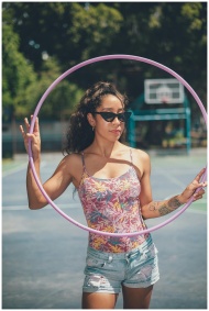 Young woman in sunglasses performing with a hula hoop on a sunny day outdoors.