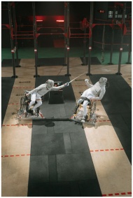 Two athletes in wheelchairs engage in a fencing match indoors.