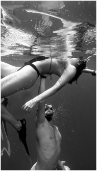 A man and woman snorkeling underwater in a black and white photograph.