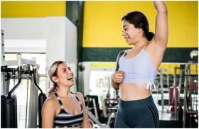 Two women in activewear sharing a joyful moment during a gym workout session.