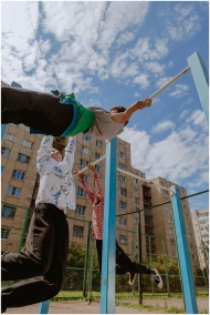 Teen boys enjoy a sunny day on the playground, hanging on pull-up bars.