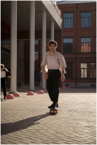 A young man skateboards through a sunlit urban area with industrial architecture.