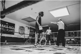 Black and white photo of a boxing match with a referee in a gym setting.