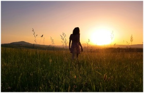 A woman in a field faces a vibrant sunset, capturing a tranquil moment of nature.