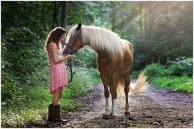 A young woman in a pink dress with a horse on a sunlit forest pathway.