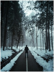 A person stands alone on a foggy forest path in winter, creating a moody atmosphere.
