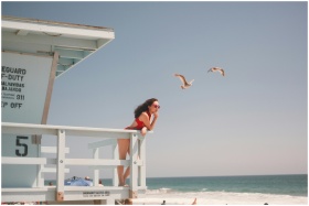 Stylish woman in red swimsuit posing at a beach lifeguard tower.