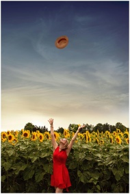 A carefree woman wearing a red dress and sunglasses joyfully throws her straw hat in a vibrant sunflower field.