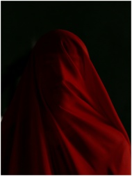 A striking portrait of a person shrouded in red fabric set against a dark background.