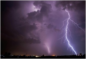 Intense lightning strikes illuminate a stormy nigh