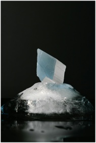 A shard of blue crystal emerging from a melting block of ice against a dark backdrop.