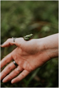 A tiny frog perches on a person's hand amidst a lu