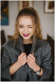 Charming young woman with red lips and casual grey coat winking indoors.