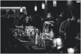 Black and white photo capturing the lively atmosphere in a bar with people socializing and a busy bartender serving drinks.