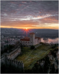 A breathtaking sunrise over Rocca Borromeo Castle in Angera, Italy, showcasing historic architecture and scenic views.