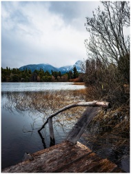 A serene view of a rustic pier in Bariloche with mountains and water reflections.