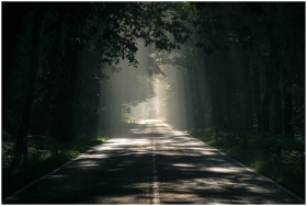 A scenic forest road illuminated by sunlight filtering through trees, evoking a serene atmosphere.