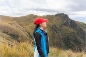 Woman in red cap admiring the Andes Mountains in Quito, Ecuador.