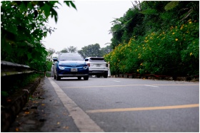 A blue and white car on a scenic road lined with yellow flowers in Hà Nội.